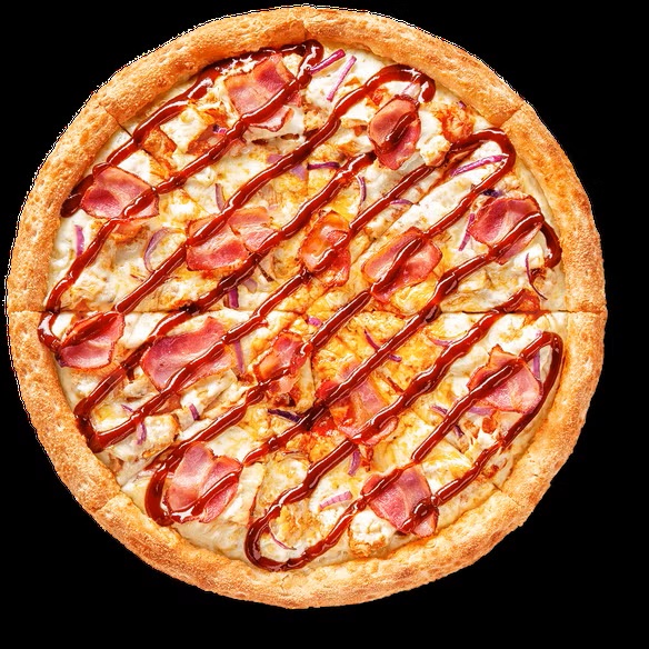 Цыпленок, бекон, соус барбекю, красный лук, моцарелла, фирменный томатный соус Пицца 30 см: Тонкое тесто. Пищевая ценность на 100 г Энерг. ценность 279.3 ккал Белки 10.4 г Жиры 12.3 г Углеводы 29.7 г Вес 640 г