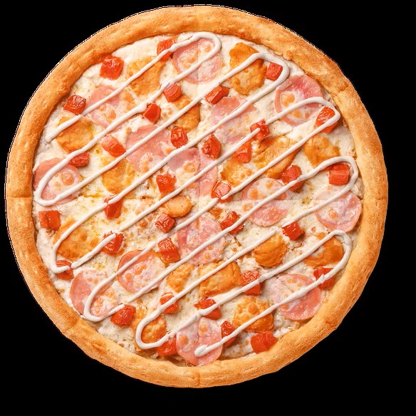 Цыпленок, ветчина, соус ранч, моцарелла, томаты, чеснок, фирменный соус альфредо Пицца 30 см: Тонкое тесто. Пищевая ценность на 100 г Энерг. ценность 221.2 ккал Белки 10.5 г Жиры 7.6 г Углеводы 27.7 г Вес 630 г
