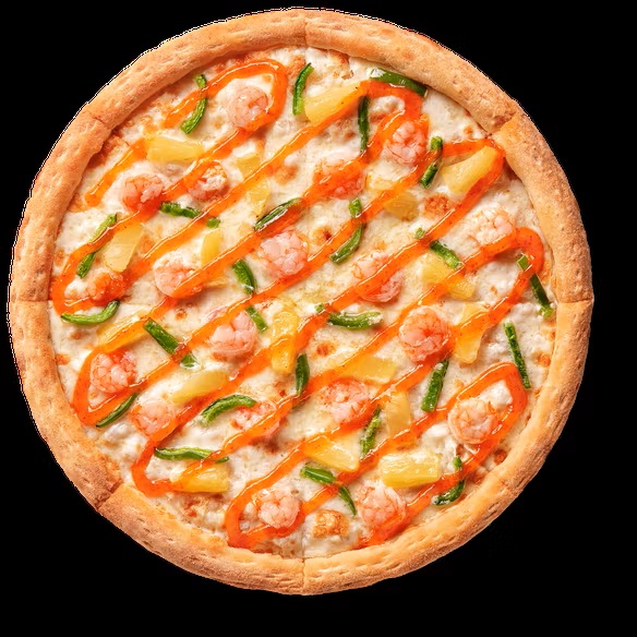 Креветки, ананасы, соус сладкий чили, сладкий перец, моцарелла, фирменный соус альфредо Пицца 25 см: Традиционное тесто. Пищевая ценность на 100 г Энерг. ценность 242 ккал Белки 9.6 г Жиры 7.6 г Углеводы 33.8 г Вес 390 г