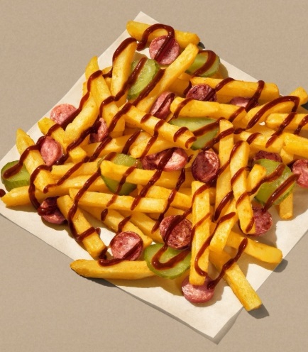 Горячий сытный обед с картофелем из печи, классическими колбасками, огурчиками маринованными и соусом барбекю Пищевая ценность на 100 г Энерг. ценность 237.5 ккал Белки 5.3 г Жиры 13.7 г Углеводы 23.3 г Вес 270 г