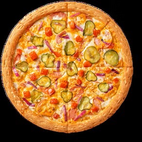 Ветчина, маринованные огурчики, томаты, красный лук, чеснок, соус бургер, моцарелла, фирменный томатный соус Пицца 25 см: Традиционное тесто. Пищевая ценность на 100 г Энерг. ценность 222.5 ккал Белки 8.3 г Жиры 7.3 г Углеводы 29.4 г Вес 420 г
