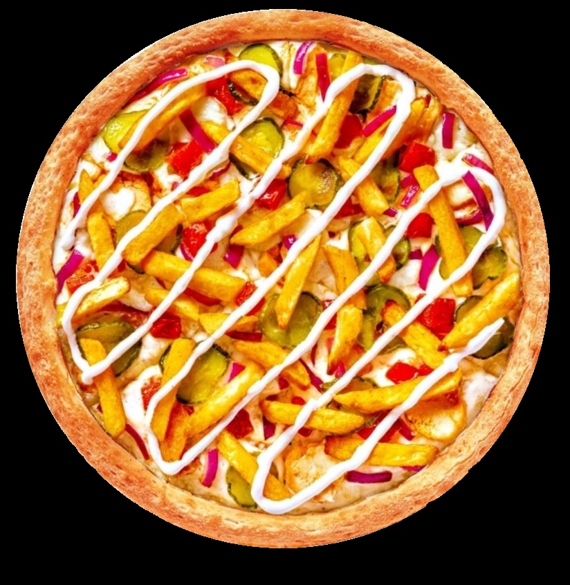 Фирменный томатный соус ,ветчина ,сыр моцарелла , чеснок ,красный лук, маринованные огурчики ,томаты ,картофель из печи ,соус ранч 25 см пицца: Традиционное тесто. Пищевая ценность на 100 г Энерг. ценность 227.3 ккал Белки 10.7 г Жиры 7.7 г Углеводы 28.9 г Вес 410 г